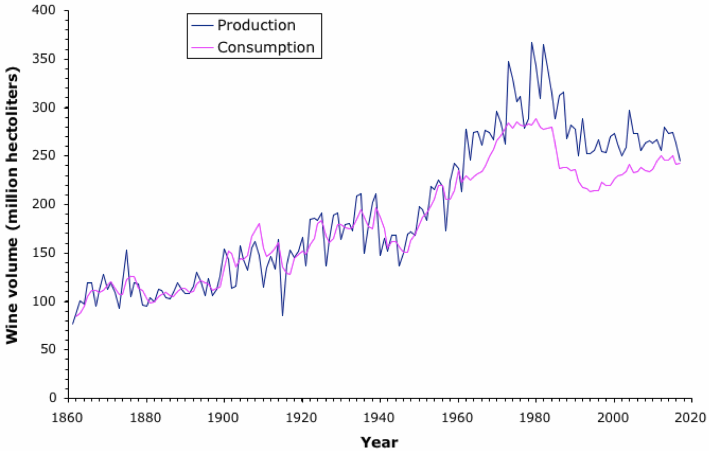 This shows that consumption kept close pace with production until 1963, although the relevant consumption is usually the year (or two) after production (since the wines do not appear on the shelves until then).